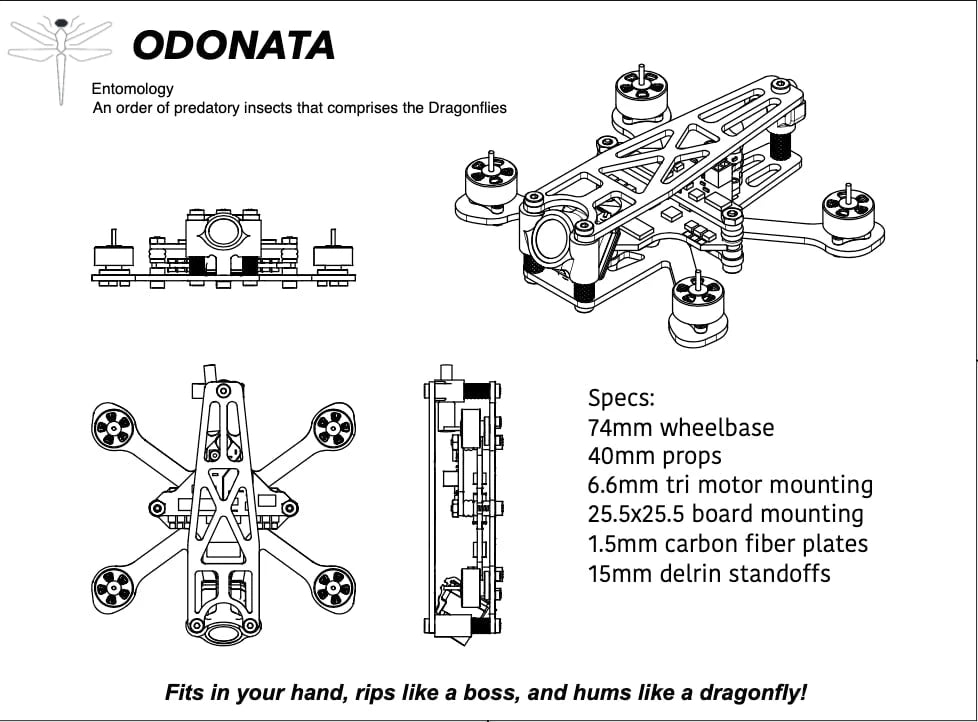 The Odonata is a nano drone that fits in your pocket, rips like a boss, and hums like a dragonfly (true to its namesake). Fits through the tiniest of gaps, and makes worlds out of small spots.