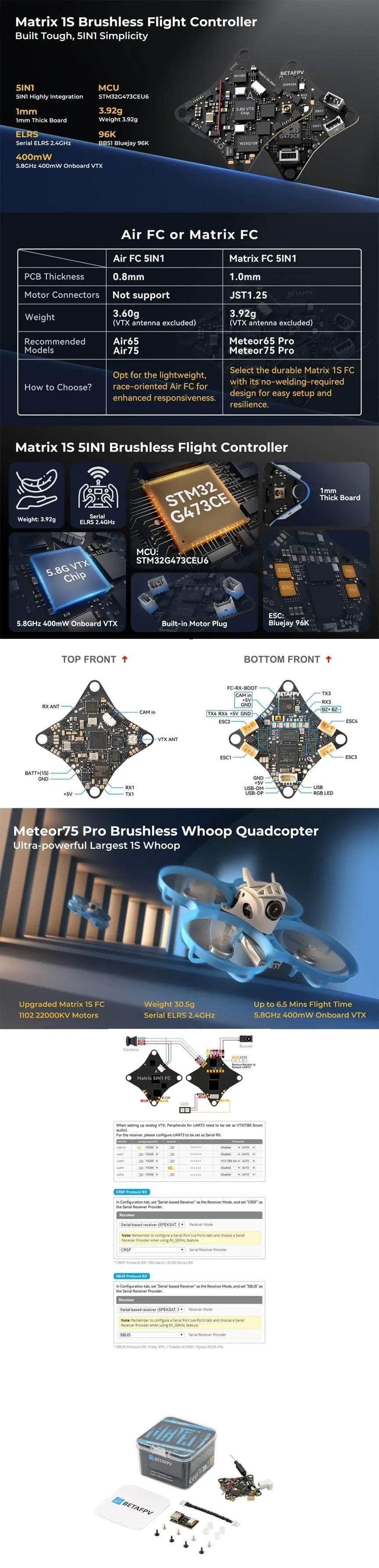 Introducing the BETAFPV Matrix 1S Brushless AIO! This user-friendly, integrated solution has a durable 1mm-thick board and built-in motor plug makes for easy repairs. Upgraded with a G473 processor, it offers a 55% performance boost over the F411 for precise racing and freestyle control. The premium 5.8GHz 400mW VTX ensures stable, high-quality video transmission.