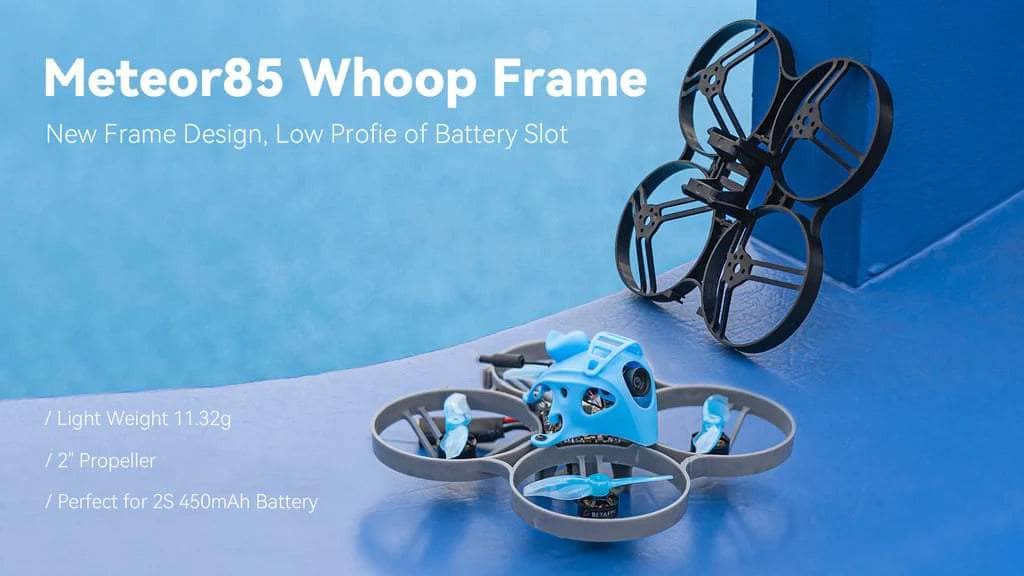 This frame is customized for 85mm whoop drone and the frame for Meteor85, Meteor85 HD Digital VTX. With a marvelous design on the battery slot which keeps a low profile and triangle bilateral stretch structure of motor mounting position, this frame weighs only 11.32g.