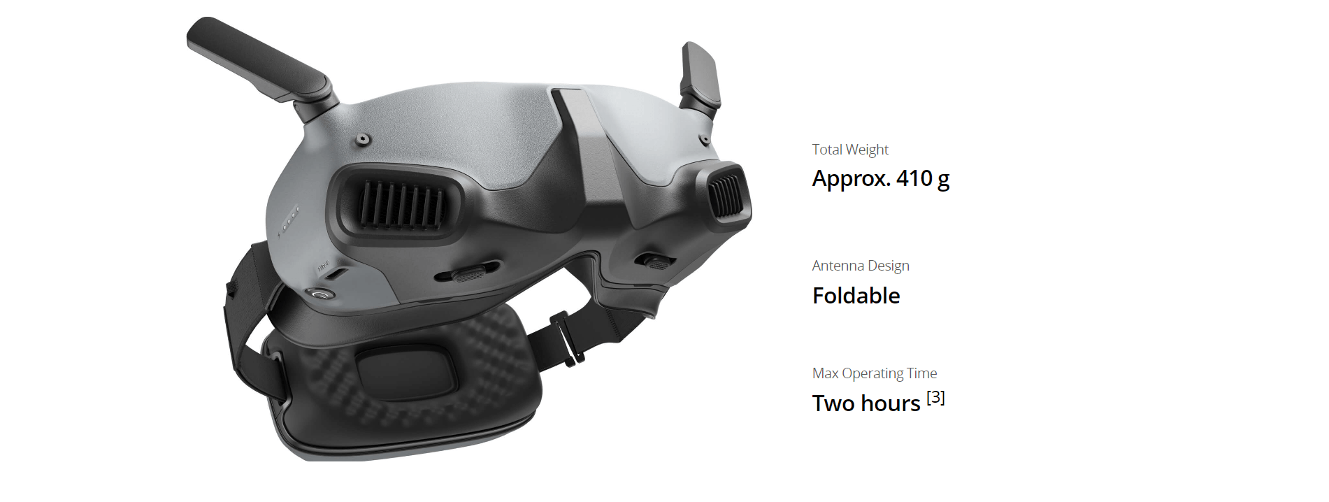 DJI Goggles Integra combines headband and battery into one, getting rid of pesky cables. Light and compact, the goggles weigh about 410 g with foldable antennas. And with a two-hour battery life, you can fly comfortably and worry-free for extended flights.