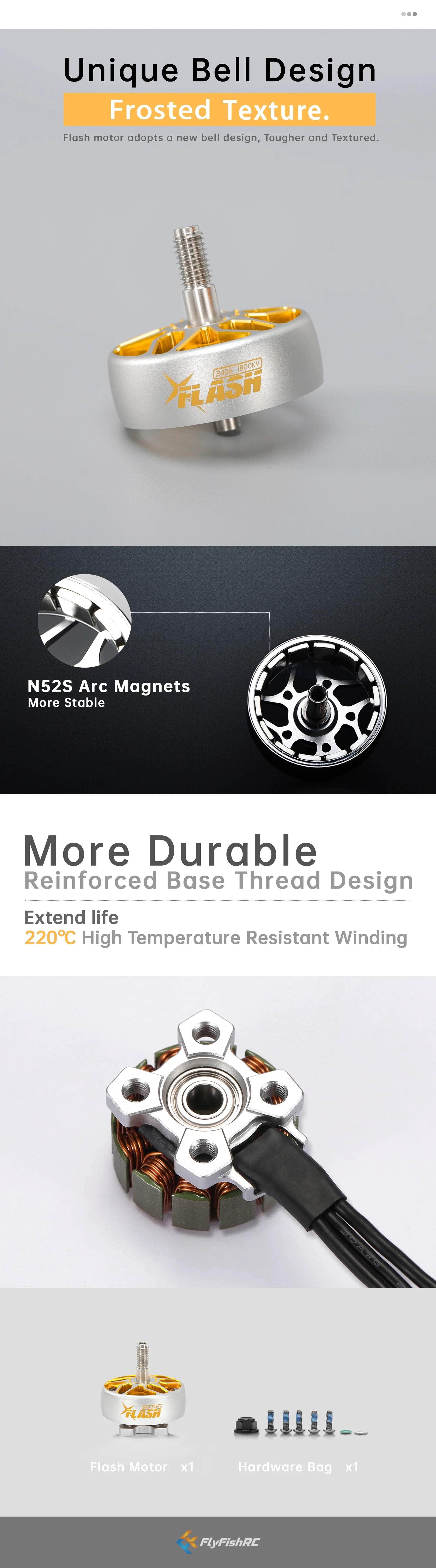 The FlyFishRC Flash 2406 Motor uses the Uni-Bell structure design providing high crash resistance while not adding more weight, providing high reliability and explosive power and thrust for FPV pilots at an affordable price.