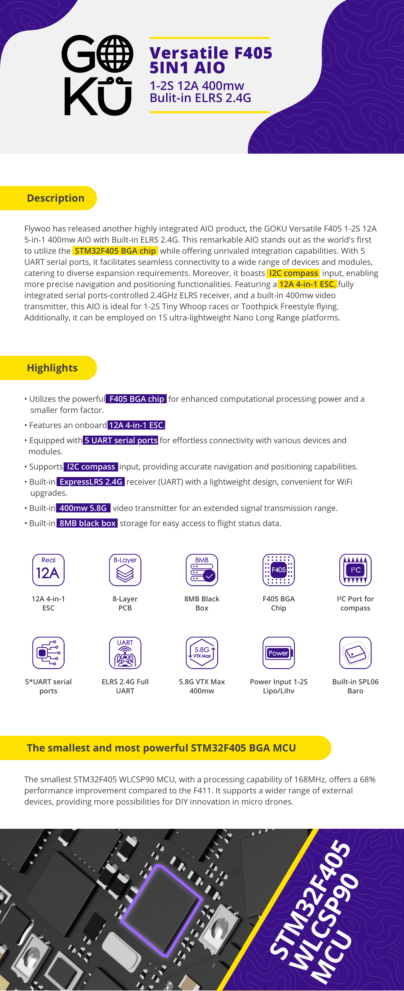Flywoo introduces a remarkable, highly integrated AlO product, the GOKU Versatile F405 1-2S, 12A 5-in-1, 400mw AlO with Built-in ELRS 2.4G. Featuring the world's first STM32F405 BGA chip. It provides 5 UART serial ports for seamless device/module connection & 12C compass input. A 12A 4-in-1 ESC, fully-integrated serial ports-controlled ELRS receiver and a built-in 400mw VTX make it perfect for Tiny Whoop races or Toothpick freestyle flying.