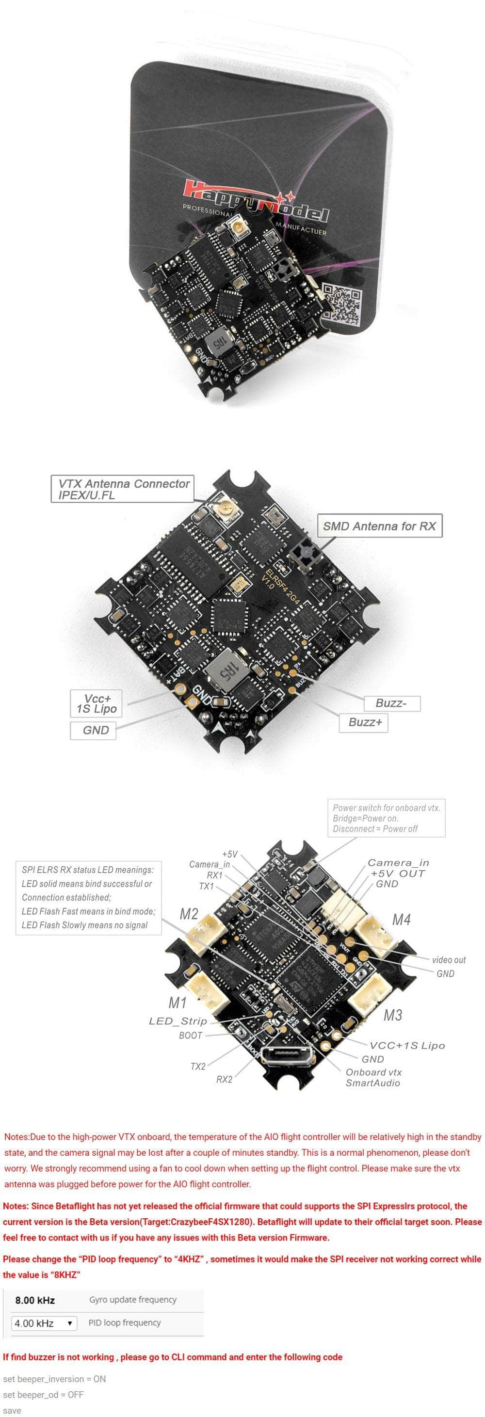 - 1x HappyModel 1S F4 AIO Toothpick/Whoop Flight Controller w/ 5A 8bit 4in1 ESC & 200mW VTX - ELRS 2.4GHz SPI