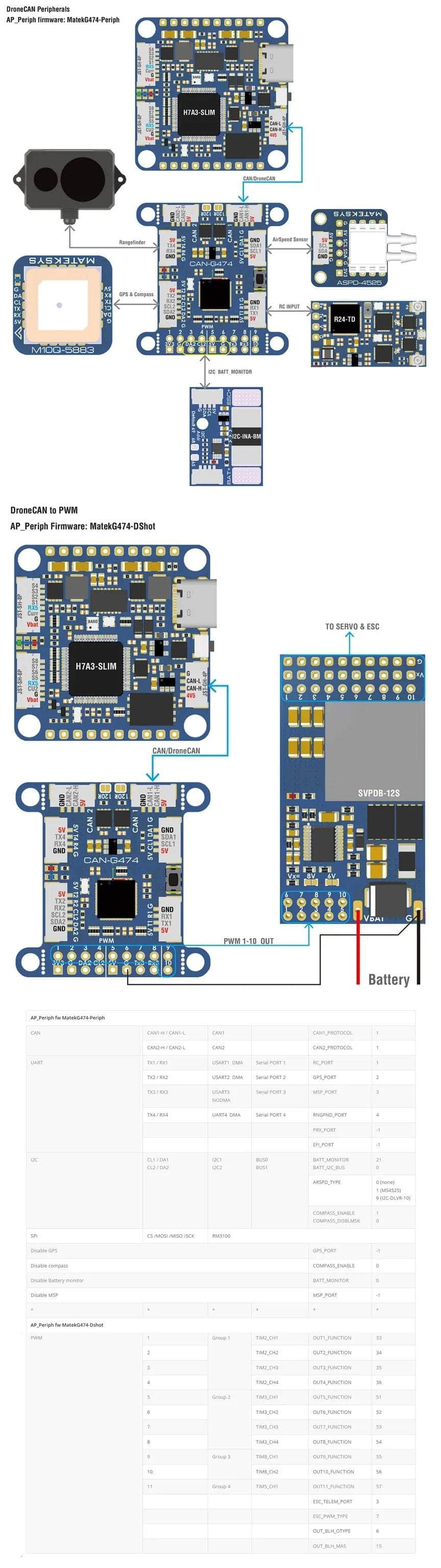 The MATEKSYS CAN-G474 enhances drone communication with its high-speed 5 Mbit/s CAN transceiver and STM32G474 MCU, built on ArduPilot's AP_Periph firmware. It supports seamless integration of ArduPilot peripherals like GNSS, Compass, Barometer, and Rangefinders into DroneCAN systems, as well as GPIO-based devices such as PWM and LED notify modules, offering a simple solution for expanding drone functionality.