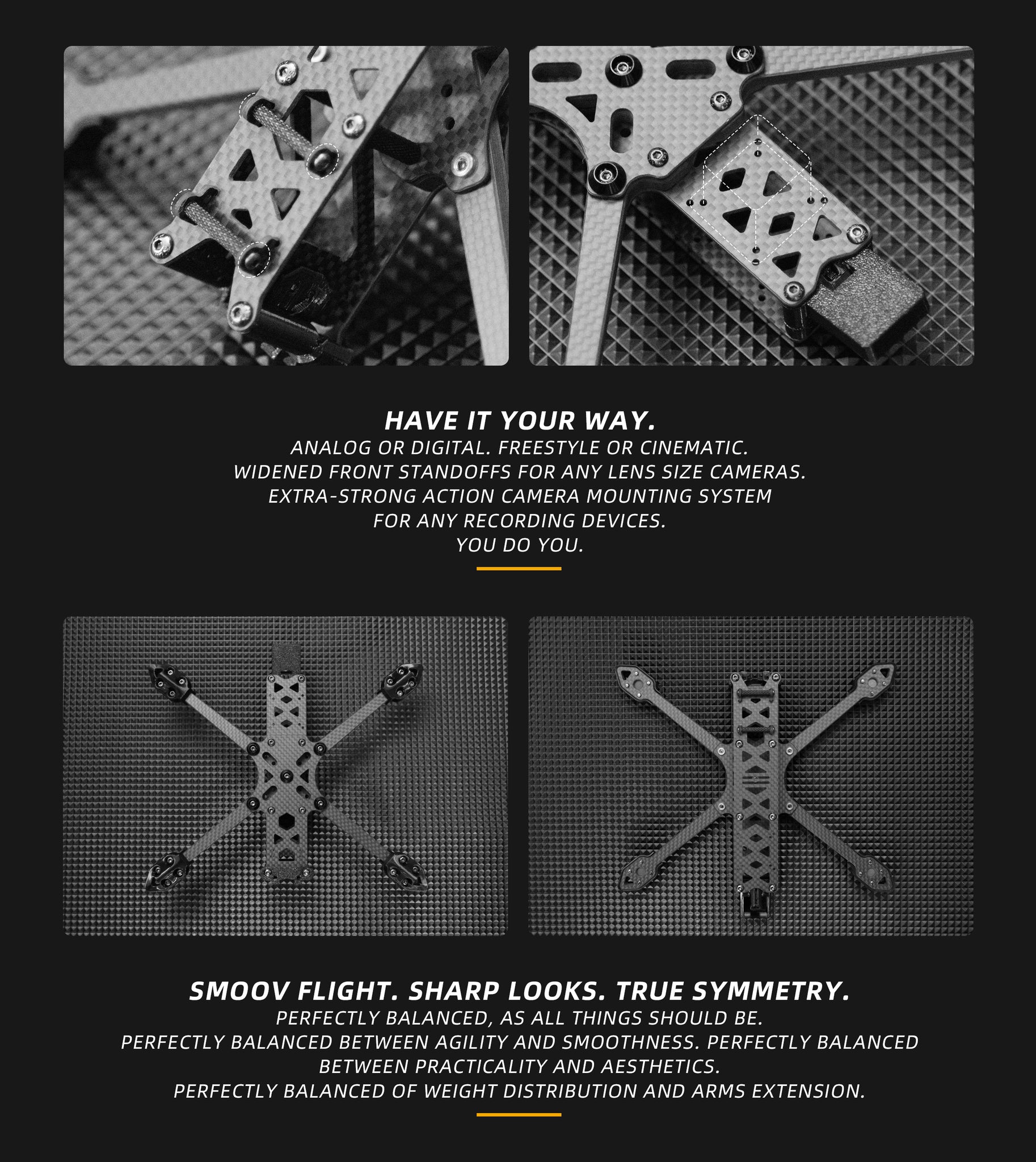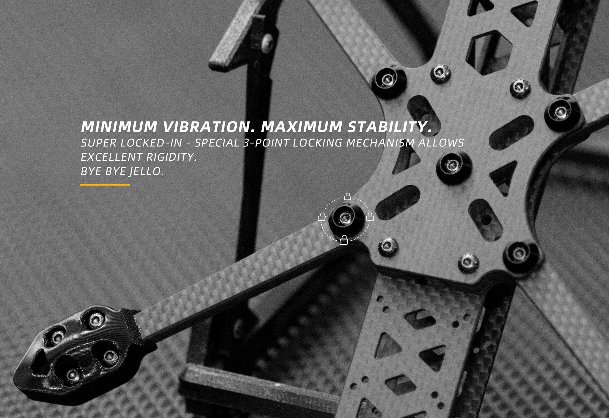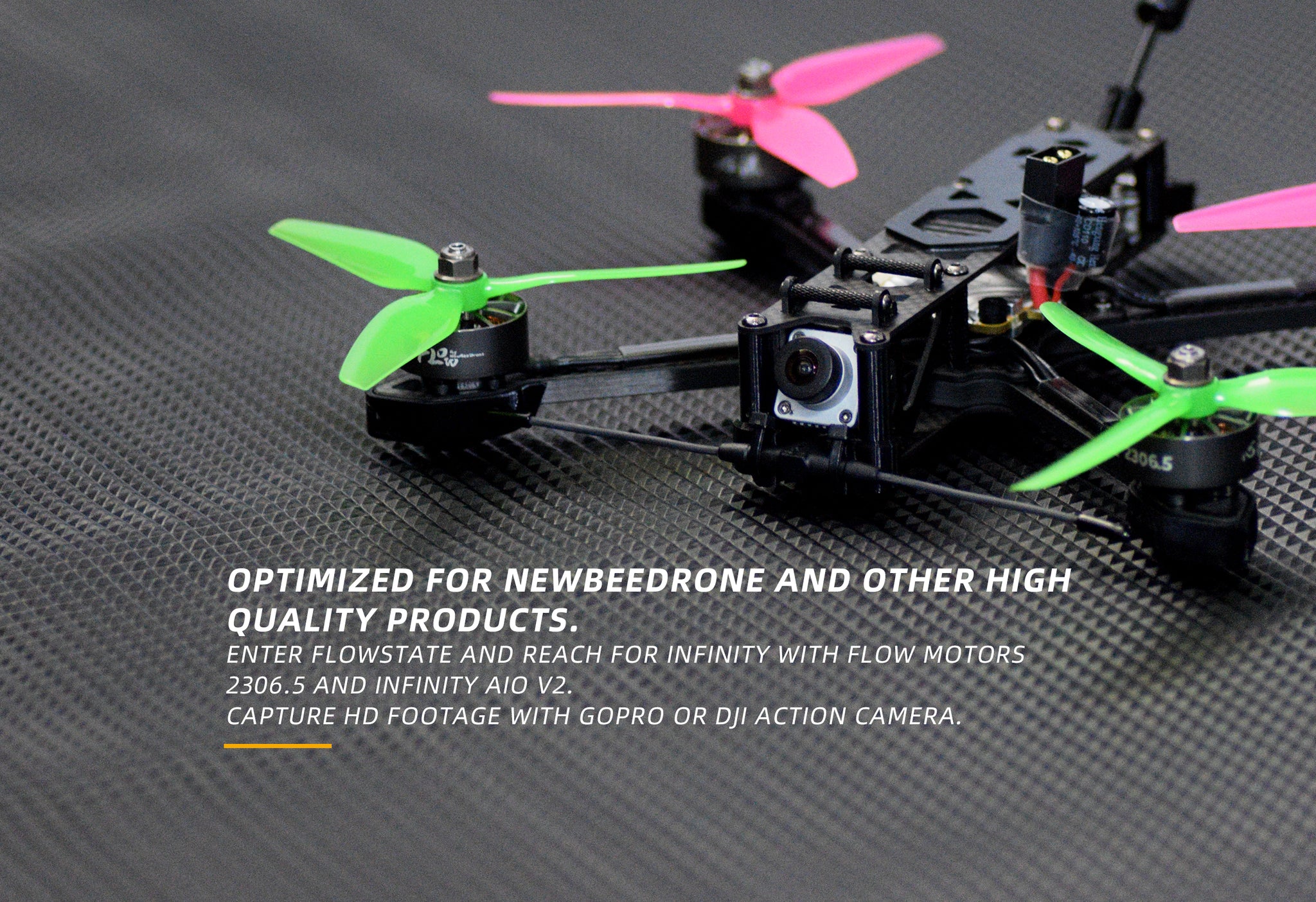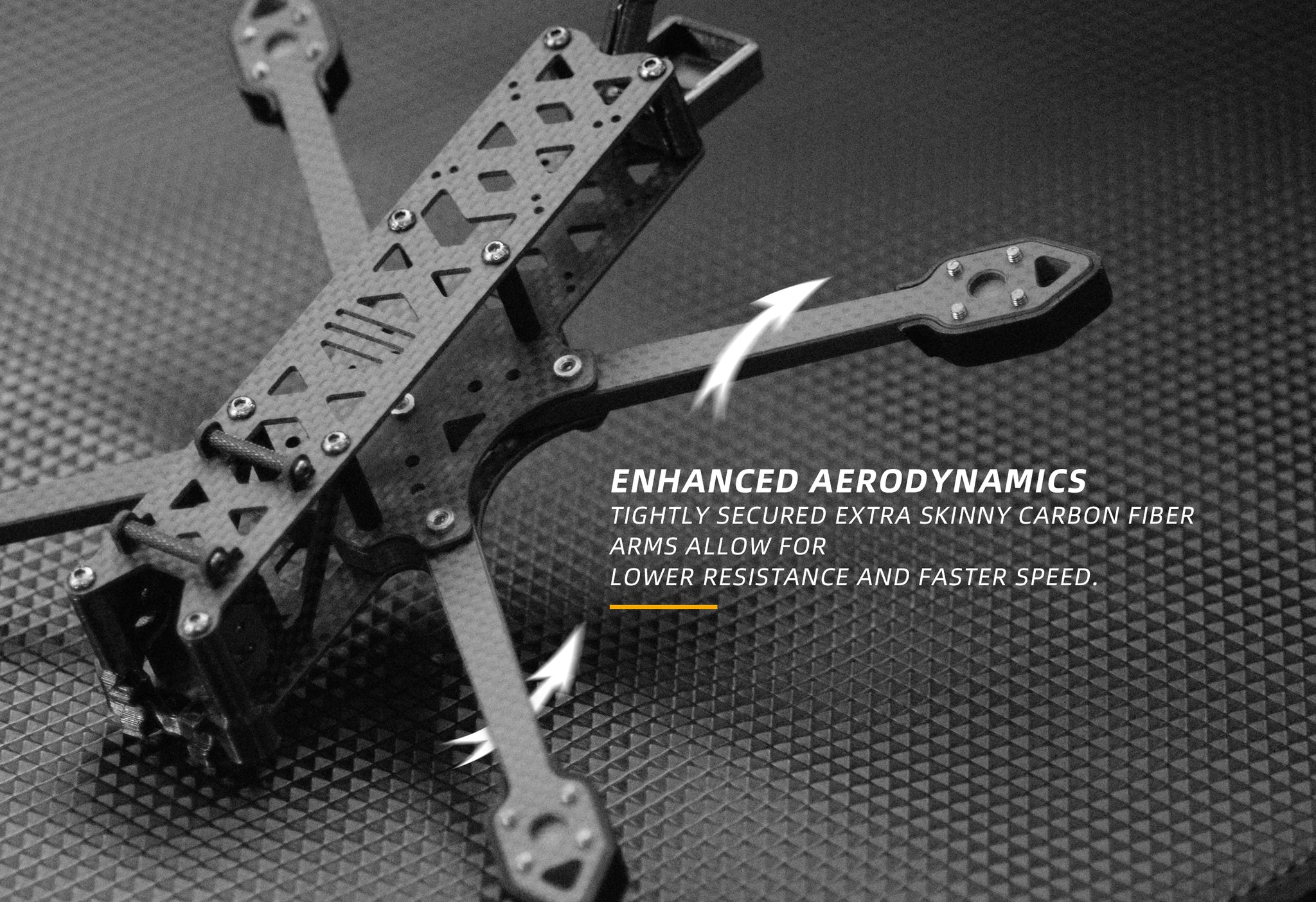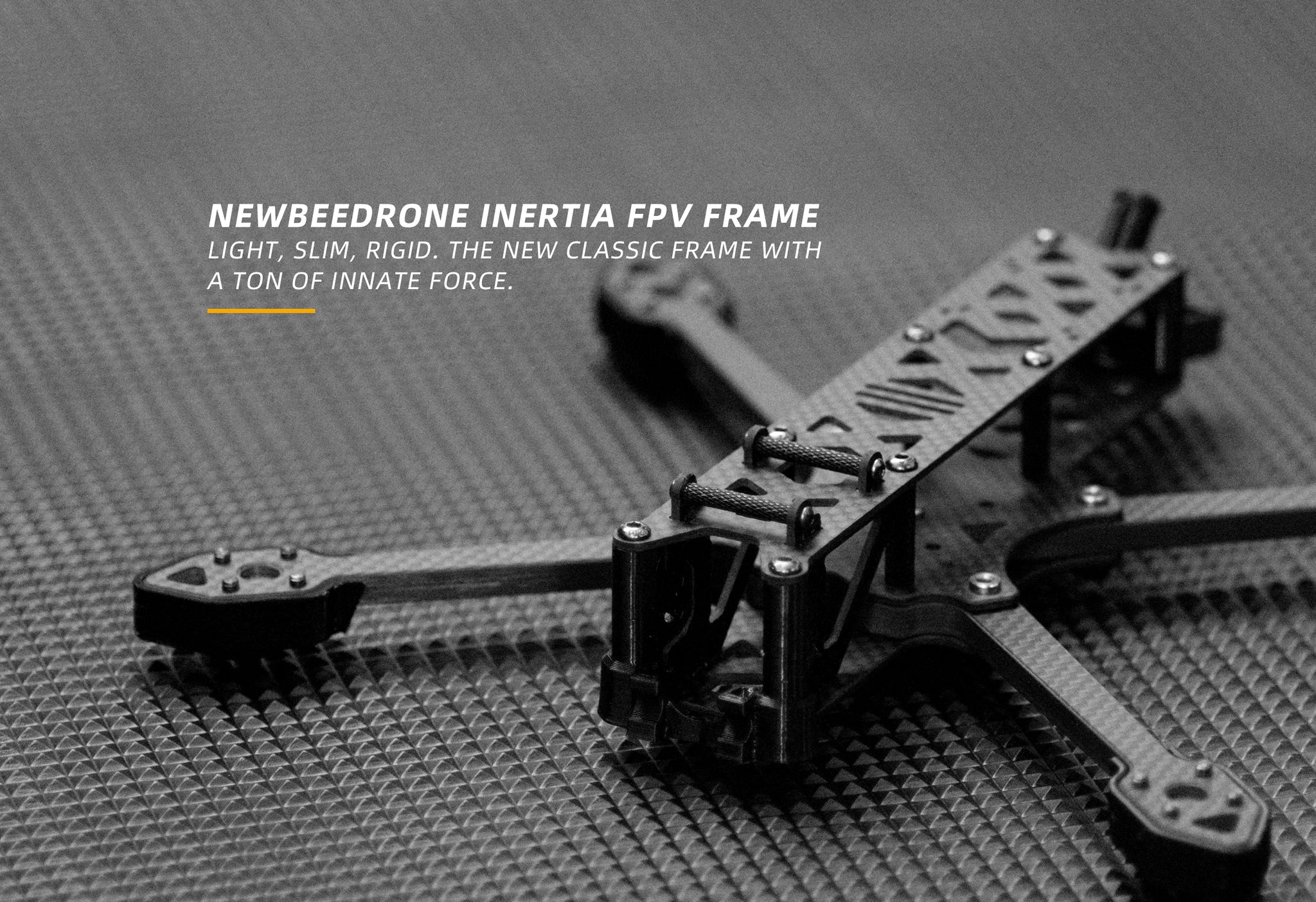 Introducing INERTIA FPV Frame, a passion project created by NewBeeDrone to push the boundary of lightweight frame design. This beast strikes a perfect balance between practicality and aesthetics. We were able to pack all of your favorite features in to this thin and light package. The crazy skinny carbon fiber arms are engineered to minimize air resistance and provide excellent structural rigidity with our special 3-point locking mechanism. The center portion of the body extends outward to further reinforce the arms and give the frame a wide-body look that’s reminiscent of a modified race car. We also ensured outstanding hardware compatibilities by including multiple mounting options for both analog and digital system. The widened front standoffs make it possible to install cameras with any lens size, perfect for the large camera of the new DJI Digital HD system. The extra-strong action camera mounting system allows you to securely carry your favorite recording devices. With its unlimited capabilities, the INERTIA frame will exceeds in all scenarios, whether you are flying cinematic, freestyle, or both.