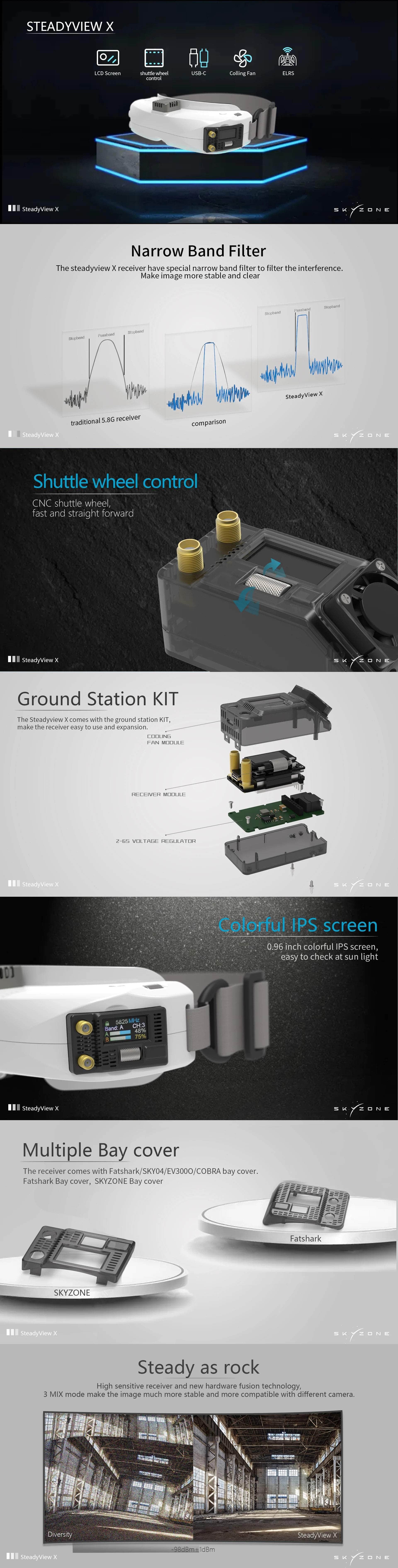 The SKYZONE SteadyView X 5.8Ghz IPS Screen Receiver Module has a direct combability and is ideal with Skyzone SKY04X V2 OLED Diversity 5.8GHz FPV Goggles